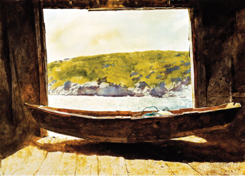 Perhaps none of the artists is better known today than the contemporary painter, Jamie Wyeth, who purchased a Monhegan Skiff from The Carpenter’s Boat Shop in the early 1980s. The son and grandson of famous artists, Jamie has lived and painted on Monhegan and nearby islands for more than 50 years, and his 1984 watercolor, Monhegan Skiff now belongs to the Farnsworth Museum in Rockland, Maine. Jamie’s longtime support of The Carpenter’s Boat Shop has earned him the gratitude of staff and apprentices for decades.