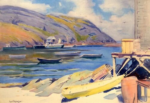 The fame of the little Monhegan Skiff has also been promulgated and spread by the innumerable artists who have painted or photographed the worthy vessels during the last century. Although the origins of the art community on Monhegan go back to the mid 19th century, it was Robert Henri, the spiritual father of the Ashcan School of Art in Manhattan, who first painted many of the boats on the island in the early years of the 20th century. His associates and other distinguished artists painted the working watercraft during Monhegan’s own Golden Age between the 1920s and World War II, and depicting the skiffs became a tradition of its own. Edward Hopper, Eric Hudson, Scars Gallagher, Leo Meissner, and Abraham Bogdanove are just a few of the artists whose works include the readily recognizable Monhegan Skiff.